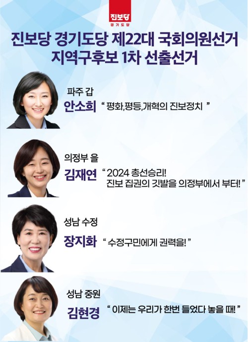 È«¼º±Ô °æ±âµµ´ç ´ëº¯ÀÎÀº "¿À´Ã Àúµµ ȼº½Ã°© ±¹È¸ÀÇ¿ø È帷Π¼±ÃâµÇ¾ú´Ù. Áøº¸´çÀÇ Èĺ¸¼±ÃâÀº ÀÌÁ¦ ½ÃÀÛÀÌ´Ù. ¾ÕÀ¸·Î 2Â÷, 3Â÷ ¼±Ãâ°úÁ¤À» °ÅÃÄ 50¿© °÷ °æ±âµµ Àü¿ª¿¡¼ Áøº¸´çÀÇ È常¦ ÁغñÇϰڴÙ"¸ç "1Â÷·Î ¼±ÃâµÈ 9¸íÀÇ È帵éÀÌ °¡Àå ÃÖ¼±µÎ¿¡¼ ¿ÀÁ÷ ¿ì¸® ¼¹Î»ýȰÀÇ ¾ÈÀü°ú ÇູÀ» À§ÇØ Áøº¸Á¤Ä¡ÀÇ µµ¾àÀ» Àϱ¸¾î°¥ °Í"À̶ó°í ¼³¸íÇß´Ù.
