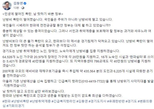±èµ¿¿¬ °æ±âµµÁö»ç´Â 26ÀÏ ÀÚ½ÅÀÇ »çȸ°ü°è¸Á¼ºñ½º(SNS)¸¦ ÅëÇØ “¹Î»ý¿¡ ¶³¾îÁø ÆøÅº, ³² Å¿ÇÏ±â ¹Ù»Û Á¤ºÎ´Ù. ±¹¹ÎµéÀÌ ½Ãº£¸®¾Æ ÇÑÆÄ¿¡ ÀüÀü±à±àÇÒ µ¿¾È Á¤ºÎ´Â ´ëü ¹» Çϰí ÀÖ¾ú´Â°¡”¶ó¸ç “³² Å¿ÇÏÁö ¾Ê°í µµ¹ÎÀÇ »î¸¸ ¹Ù¶óº¸°Ú´Ù. ÇÑÆÄ¿Í ³¹æºñ ÆøÅºÀ¸·Î °Ç°°ú »ýÁ¸À» À§Çù¹Þ´Â µµ¹ÎÀÌ ¾øµµ·Ï ÃÖ¼±À» ´ÙÇϰڴٔ°í ¸»Çß´Ù.