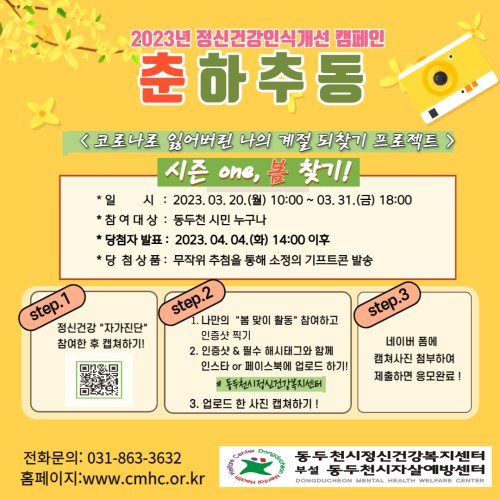 Âü¿© ¹æ¹ýÀº ¿À´Â 20ÀϺÎÅÍ 31ÀϱîÁö ¼¾ÅÍ È¨ÆäÀÌÁö(www.cmhc.or.kr) ¶Ç´Â Æ÷½ºÅÍ QRÄÚµå·Î Á¢¼ÓÇÏ¿© “Á¤½Å°Ç° ÀÚ°¡Áø´Ü ½Ç½Ã ĸó »çÁø ¹× º½¸ÂÀÌ È°µ¿»çÁø”À» °³ÀÎ ÀνºÅ¸±×·¥ ¶Ç´Â ÆäÀ̽ººÏ¿¡ µî·Ï ÈÄ Ä¸Ã³ÇÏ¿© ¼¾ÅÍ È¨ÆäÀÌÁö À̺¥Æ® ÃáÇÏÃßµ¿ ¾È³»¿¡ µû¶ó ³×À̹öÆû¿¡ ¿Ã¸®¸é µÈ´Ù. ½Ã¹Î ´©±¸³ª Âü¿©ÇÒ ¼ö ÀÖÀ¸¸ç Âü¿©ÀÚ 50¸íÀ» Ãß÷ÇÏ¿© ¼ÒÁ¤ÀÇ ¸ð¹ÙÀÏ ÄíÆùÀ» Áö±ÞÇÒ ¿¹Á¤ÀÌ´Ù.