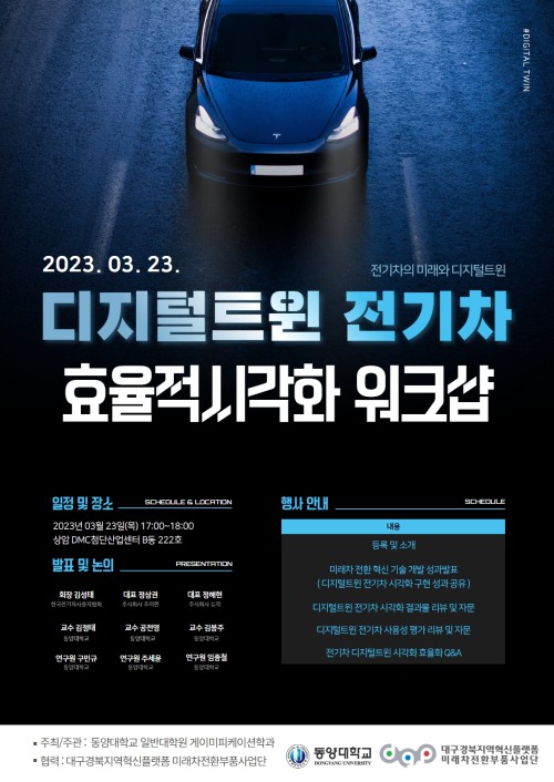 À̹ø ¿öÅ©¼¥Àº ÁöÀÚü-´ëÇÐ Çù·Â±â¹Ý Áö¿ªÇõ½Å»ç¾÷(ÀÌÇÏ RIS»ç¾÷)¿¡ ¼±Á¤µÈ ´ë±¸°æºÏÁö¿ªÇõ½ÅÇ÷§Æû ¹Ì·¡Â÷ÀüȺÎǰ»ç¾÷´ÜÀÇ ¹Ì·¡Â÷R&DÄݶóº¸ÀÇ ¼¼ºÎ°úÁ¦ 'µðÁöÅÐÆ®À© Àü±âÂ÷ ½Ã°¢È'¸¦ ¼öÇàÁßÀÎ µ¿¾ç´ëÇб³ ÀϹݴëÇпø °ÔÀ̹ÌÇÇÄÉÀ̼ÇÇаú°¡ ÁÖ°üÇÏ¿© °³ÃÖÇÑ´Ù.