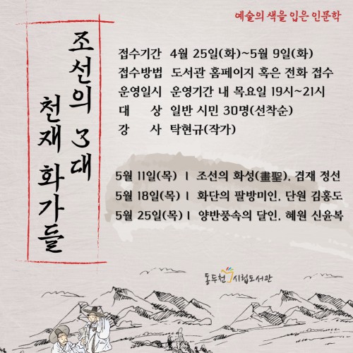 5¿ù¿¡´Â <Á¶¼±ÀÇ 3´ë õÀç Ȱ¡µé>À» ÁÖÁ¦·Î ŹÇö±Ô ÀÛ°¡¿Í ÇÔ²² Á¶¼±ÀÇ È¼º °âÀç Á¤¼±, È´ÜÀÇ ÆÈ¹æ¹ÌÀÎ ´Ü¿ø ±èÈ«µµ, ¾ç¹Ý dz¼ÓÀÇ ´ÞÀÎ Çý¿ø ½ÅÀ±º¹À» ¾Ë¾Æº»´Ù. Á¶¼±ÀÇ 3´ë õÀç Ȱ¡·Î ºÒ¸®´Â À̵éÀÇ ÀÛǰÀ» ÅëÇØ Çѱ¹ ¹Ì¼ú»çÀÇ Áø¼ö¸¦ »ìÆìº¼ ¿¹Á¤ÀÌ´Ù.