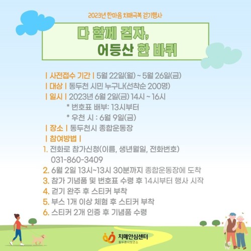 Ä¡¸Å±Øº¹ °È±âÇà»ç¿Í °ü·ÃÇÑ ÀÚ¼¼ÇÑ »çÇ×Àº µ¿µÎõ½Ã Ä¡¸Å¾È½É¼¾ÅÍ(031-860-3409)·Î ¹®ÀÇÇÏ¸é µÈ´Ù.