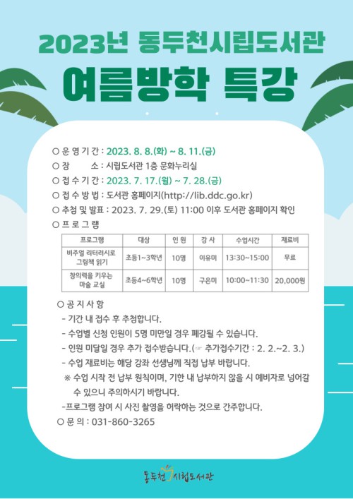 µ¿µÎõ½Ã(½ÃÀå ¹ÚÇü´ö) Æò»ý±³À°¿ø ½Ã¸³µµ¼°üÀº ¿©¸§¹æÇÐÀ» ¸ÂÀÌÇÏ¿© Ãʵî 1ÇгâºÎÅÍ 6ÇгâÀ» ´ë»óÀ¸·Î ¿À´Â 8¿ù 8ÀϺÎÅÍ 8¿ù 11ÀϱîÁö ¹æÇРƯ°À» ¿î¿µÇÑ´Ù°í ¹àÇû´Ù.