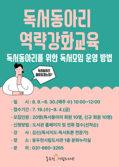 À̹ø ±³À° ´ë»óÀº ±âÁ¸ ȸ¿øµé À̿ܿ¡ ½Å±Ô ȸ¿ø 10¸íÀ» ½Åû¹Þ°í 7¿ù 19ÀϺÎÅÍ 8¿ù 4ÀϱîÁö ¼±Âø¼øÀ¸·Î ȨÆäÀÌÁö ½Åû ¶Ç´Â À¯¼± ÀüÈ·Î Á¢¼öÇÒ ¼ö ÀÖ´Ù. ±âŸ ÀÚ¼¼ÇÑ »çÇ×Àº µµ¼°üÆÀ(860-3265)À¸·Î ¹®ÀÇÇϰųª µµ¼°ü ȨÆäÀÌÁö¸¦ Âü°íÇÏ¸é µÈ´Ù.