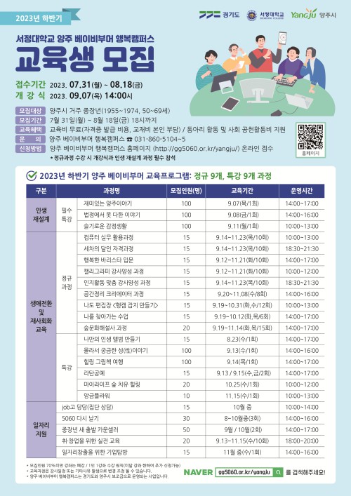 À̹ø ±³À° ÇÁ·Î±×·¥Àº 7¿ù 31ÀϺÎÅÍ 8¿ù 18ÀϱîÁö ¸ðÁýÇϸç, °³°½ÄÀº 9¿ù 7ÀÏ¿¡ ÁøÇàµÉ ¿¹Á¤ÀÌ´Ù. ½£¹®ÈÇØ¼³»ç °úÁ¤, ÀÎÁöȰµ¿ ¸ÂÃã °»ç ¾ç¼º°úÁ¤ µî ÁßÀå³âÀÇ »ý¾ÖÀüȯ ¹× Àç»çȸȱ³À°, Àλý Àç¼³°è ±³À°À» ºñ·ÔÇÏ¿© ´Ù¾çÇÑ ÁÖÁ¦ÀÇ °úÁ¤ÀÌ ¿î¿µµÉ ¿¹Á¤À̸ç, ±³À° Âü¿©ÀÚµéÀº µ¿¾Æ¸®È°µ¿°ú »çȸ°øÇåȰµ¿¿¡µµ Âü¿©ÇÒ ¼ö ÀÖ´Ù. ¶ÇÇÑ, Àü¿ë°ø°£À» Á¦°øÇÏ¿© ÇнÀ°ú ±³·ùÀÇ ±âȸ¸¦ Á¦°øÇϸç, ÀÏÀÚ¸® ¿¬°èµµ Áö¿øµÈ´Ù.