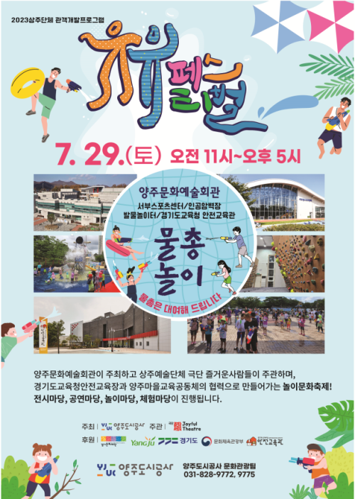 À̹ø 'À¯À¯(you-you)' Æä½ºÆ¼¹úÀº ¾çÁÖ¼Ò³â¼Ò³àÇÕâ´Ü µî ¾çÁÖ Áö¿ª µ¿¾Æ¸®µé°ú, Àü¹®¿¹¼úÀεéÀÇ °ø¿¬°ú °æ±âµµ±³À°Ã» ¾ÈÀü±³À°°ü, Àΰø ¾Ïº®Å¸±â, ÀüÅë Àü·¡³îÀÌ µî ´Ù¾çÇÑ Ã¼Çè°ú ³îÀÌ·Î ±¸¼ºµÆÀ¸¸ç, ´ëÇ¥ ÇÁ·Î±×·¥ÀÎ ¹°ÃÑ ³îÀ̰¡ ¸¶Áö¸· ´ë¹Ì¸¦ Àå½ÄÇÏ°Ô µÈ´Ù. ¶ÇÇÑ, °æ±âµµ±³À°Ã»¾ÈÀü±³À°°ü¿¡¼ ¹°³îÀÌ ¾ÈÀü ±³À° µîÀ» ÅëÇØ ¿©¸§Ã¶ ¹°³îÀÌ¿¡ ´ëÇÑ °æ°¢½ÉÀ» Àϱú¿î´Ù.