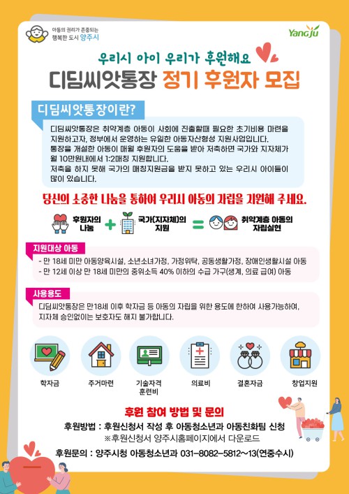 ¾çÁÖ½Ã(½ÃÀå °¼öÇö)´Â ¾çÁֽà Ãë¾à°èÃþ ¾Æµ¿ÀÇ ÀÚ¸³ ½ÇÇöÀ» À§ÇÑ ‘µðµõ¾¾¾ÑÅëÀå’ Á¤±âÈÄ¿øÀÚ¸¦ »ó½Ã ¸ðÁýÇϰí ÀÖ´Ù.