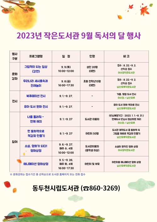 ÀÛÀºµµ¼°ü µ¶¼ÀÇ ´Þ ¹®È°ÁÂÀÎ “±×¸²Ã¥ÀÌ µÇ´Â ÀÏ»ó”°ú “¿ì¸®³ª¶ó ¼¼½Ãdz¼Ó°ú Àü·¡³îÀÌ”¿¡ Âü¿©ÇϰíÀÚ ÇÏ´Â ½Ã¹ÎÀº 9¿ù 2ÀϱîÁö ¼±Âø¼øÀ¸·Î µµ¼°ü ȨÆäÀÌÁö ¶Ç´Â ÀüÈ·Î Á¢¼ö °¡´ÉÇϸç, ±âŸ ±Ã±ÝÇÑ »çÇ×Àº µµ¼°ü ȨÆäÀÌÁö ¶Ç´Â ½Ã¸³µµ¼°ü(031-860-3269)À¸·Î ¹®ÀÇÇÏ¸é µÈ´Ù.