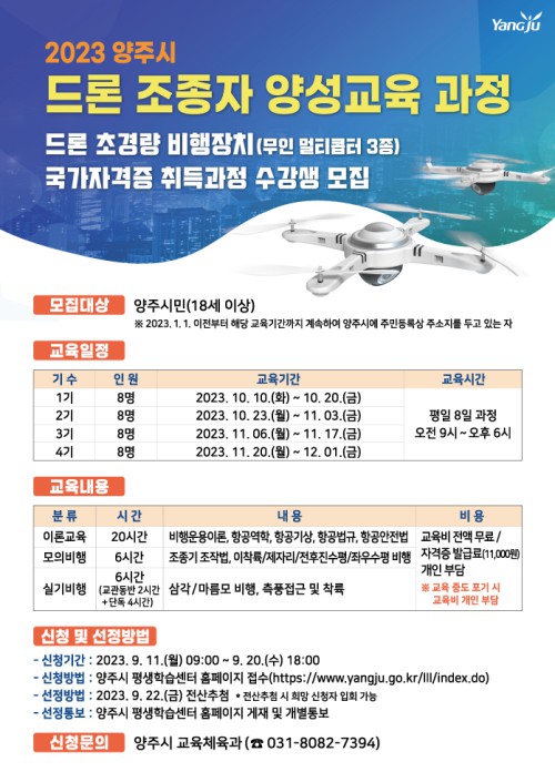 ¾çÁÖ½Ã(½ÃÀå °¼öÇö)´Â µå·Ð »ê¾÷ ÇöÀåÀÇ Àη¼ö¿ä Áõ°¡¿¡ µû¸¥ ½Ç¹«Çü ÀÎÀç À°¼ºÀ» À§ÇØ ‘2023³â ¾çÁֽà µå·Ð Á¶Á¾ÀÚ ¾ç¼º±³À° °úÁ¤’±³À°»ýÀ» ¸ðÁýÇÑ´Ù°í 29ÀÏ ¹àÇû´Ù.