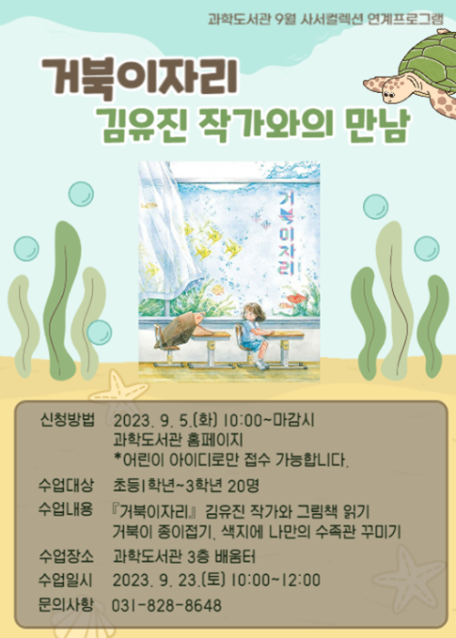 ÀÇÁ¤ºÎ°úÇеµ¼°üÀº 9¿ù ¾î¸°ÀÌºÐ¾ß »ç¼Ä÷º¼Ç ‘¹¹°¡ µÇµç ±¦Âú¾Æ’¿Í ¿¬°èÇØ 9¿ù 23ÀÏ ÃʵîÇлý 1~3Çгâ 20¸íÀ» ´ë»óÀ¸·Î <°ÅºÏÀÌÀÚ¸®> ±èÀ¯Áø ÀÛ°¡¿ÍÀÇ ¸¸³²À» ÁøÇàÇÑ´Ù.