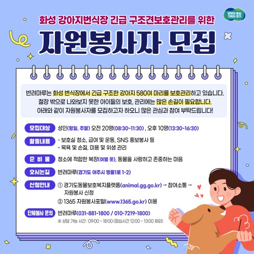 ÀÚ¿øºÀ»ç¸¦ Èñ¸ÁÇÏ´Â »ç¶÷Àº °æ±âµµµ¿¹°º¸È£º¹ÁöÇ÷§Æû(animal.gg.go.kr) ¶Ç´Â 1365 ÀÚ¿øºÀ»çÆ÷ÅÐ(www.1365.go.kr)¿¡¼ ½ÅûÇÏ¸é µÈ´Ù. ÀÚ¼¼ÇÑ ³»¿ëÀº ¹Ý·Á¸¶·ç(031-881-1800, 010-7219-1800)À¸·Î ¹®ÀÇÇÏ¸é µÈ´Ù.