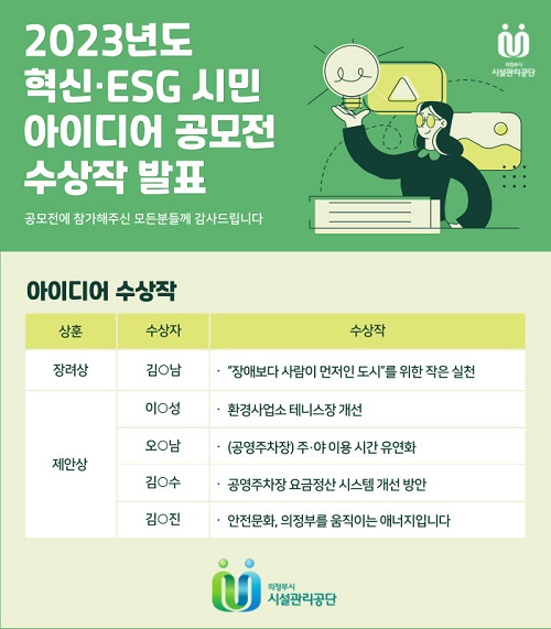 ÀÇÁ¤ºÎ½Ã½Ã¼³°ü¸®°ø´Ü(ÀÌ»çÀå ÀÓÇØ¸í)Àº Çõ½Å·ESG ½Ã¹Î ¾ÆÀ̵ð¾î °ø¸ðÀü ¼ö»óÀÛÀ» ¼±Á¤Çß´Ù°í 11ÀÏ ¹àÇû´Ù.
