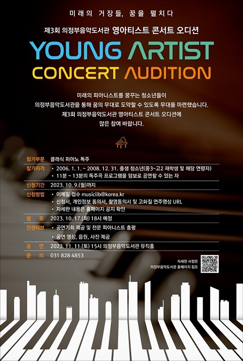 Âü°¡¸¦ ¿øÇϴ û¼Ò³âÀº ½É»ç¿ë µ¿¿µ»ó°ú ½Åû ¼·ù¸¦ 10¿ù 9ÀϱîÁö À̸ÞÀÏ(musiclib@korea.kr)·Î Á¦ÃâÇÏ¸é µÈ´Ù. ½É»ç¿ë µ¿¿µ»ó ¿ä°Ç ¹× ¿Àµð¼Ç Âü°¡°î µî ÀÚ¼¼ÇÑ »çÇ×Àº ȨÆäÀÌÁö(www.uilib.go.kr/music) °øÁö»çÇ×À» Âü°íÇϰųª ÀüÈ(031-828-4853)·Î ¹®ÀÇÇϸé È®ÀÎ °¡´ÉÇÏ´Ù.