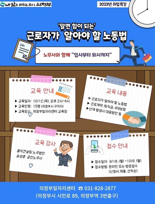 ±³À°Àº 10¿ù 12ÀÏ ÀÏÀÚ¸®¼¾ÅÍ(ÀÇÁ¤ºÎ¿ª 3¹ø Ãⱸ)¿¡¼ ¿ÀÈÄ 2½ÃºÎÅÍ 4½Ã±îÁö ÁøÇàÇÑ´Ù. °øÀÎ ³ë¹«»ç°¡ ±Ù·Î°è¾à ÀÛ¼º, ÅðÁ÷±Ý, »êÀç ¹ß»ý½Ã ´ëÀÀ¹æ¾È µî ÀÔ»çºÎÅÍ Åð»ç±îÁö ±Ù·ÎÀÚ°¡ ²À ¾Ë¾Æ¾ß ÇÒ ³ëµ¿¹ýÀ» »ç·Ê Áß½ÉÀ¸·Î ±³À°ÇÑ´Ù.
