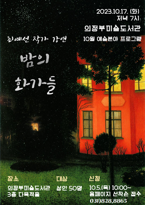ÀÇÁ¤ºÎ¹Ì¼úµµ¼°üÀº 10¿ù 17ÀÏ ¿ÀÈÄ 7½ÃºÎÅÍ '¹ãÀÇ È°¡µé' ÃÖ¿¹¼± ÀÛ°¡ÀÇ °¿¬È¸¸¦ ÁøÇàÇÑ´Ù.