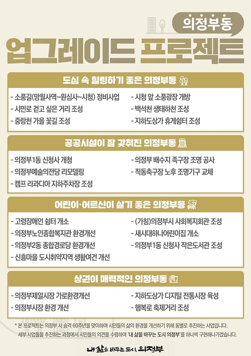 ½Ã´Â ¡ãµµ½É ¼Ó Èú¸µÇϱâ ÁÁÀº ÀÇÁ¤ºÎµ¿ ¡ã°ø°ø½Ã¼³ÀÌ Àß °®ÃçÁø ÀÇÁ¤ºÎµ¿ ¡ã¾î¸°ÀÌ‧¾î¸£½ÅÀÌ »ì±â ÁÁÀº ÀÇÁ¤ºÎµ¿ ¡ã»ó±ÇÀÌ ¸Å·ÂÀûÀÎ ÀÇÁ¤ºÎµ¿À» ¸ñÇ¥·Î 22°³ÀÇ ¼¼ºÎ»ç¾÷À» ÃßÁøÇØ ³ª°¥ °èȹÀÌ´Ù.