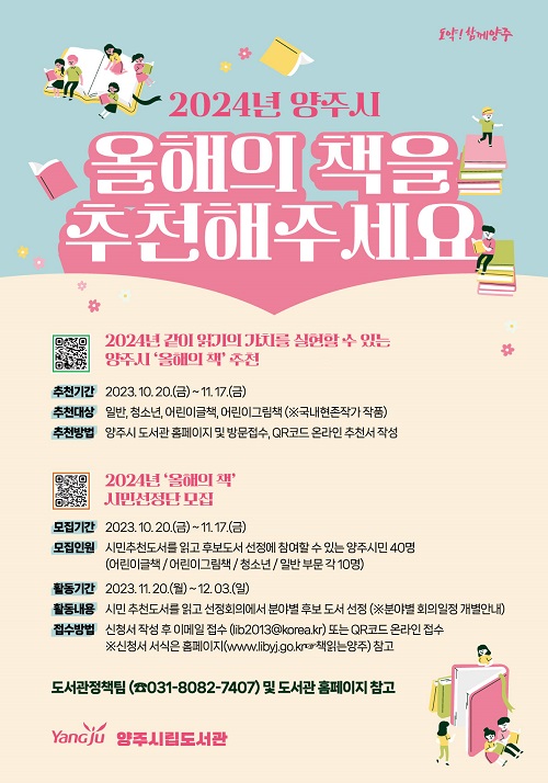 ¾çÁÖ½Ã(½ÃÀå °¼öÇö)´Â ¿À´Â 11¿ù 17ÀϱîÁö Ã¥À¸·Î Çϳª µÇ´Â ‘Ã¥ Àд µµ½Ã ¾çÁÖ’ Á¶¼ºÀ» À§ÇØ ‘2024³â ¾çÁֽà ¿ÃÇØÀÇ Ã¥’À» Ãßõ¹Þ´Â´Ù.