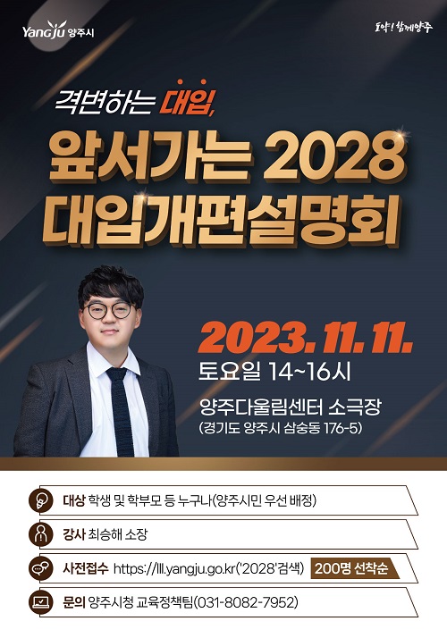 ¾çÁÖ½Ã(½ÃÀå °¼öÇö)´Â ´ÙÀ½´Þ 11ÀÏ(Åä) »ï¼þµ¿ ¼ÒÀç ¾çÁִٿ︲¼¾ÅÍ¿¡¼ °ü³» Çлý°ú ÇÐºÎ¸ð¿¡°Ô ´Ù¾çÇϰí ÃÖ½ÅÈµÈ ÀÔ½ÃÁ¤º¸ Á¦°øÀ» À§ÇØ ‘2023³â ¾çÁֽà 2028 °³Æí ´ëÀÔ¼³¸íȸ’¸¦ ÁøÇàÇÑ´Ù.