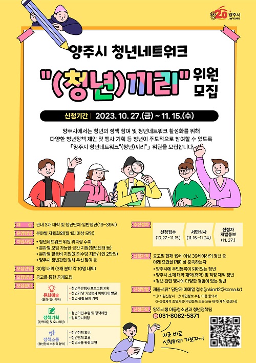 ¾çÁÖ½Ã(½ÃÀå °¼öÇö)´Â û³âÀÇ Á÷Á¢ Á¤Ã¥Âü¿© ¹× û³â³×Æ®¿öÅ© Ȱ¼ºÈ¸¦ À§ÇØ ‘¾çÁֽà û³â³×Æ®¿öÅ© (û³â)³¢¸®’ ±¸¼ºÀ§¿øÀ» ¿À´Â 11¿ù 15ÀϱîÁö ¸ðÁýÇÑ´Ù°í ¹àÇû´Ù.