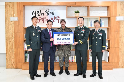 ¾çÁÖ½Ã(½ÃÀå °¼öÇö)´Â Áö³ 7ÀÏ À°±º Á¦7365ºÎ´ë(´ë·É ³ëÁ¤È£)¿¡¼ ½ÃûÀ» ¹æ¹®ÇØ À°±º Á¦10ȸ ±º°¡ÇÕâ°æ¿¬´ëȸ¿¡¼ ¹ÞÀº »ó±ÝÀ» Æ÷ÇÔÇÑ ¼º±Ý 1¹é¸¸¿øÀ» ¾çÁֽà ¾î·Á¿î ÀÌ¿ôÀ» µ½´Âµ¥ ½á´Þ¶ó¸ç ±âºÎÇß´Ù°í ¹àÇû´Ù.