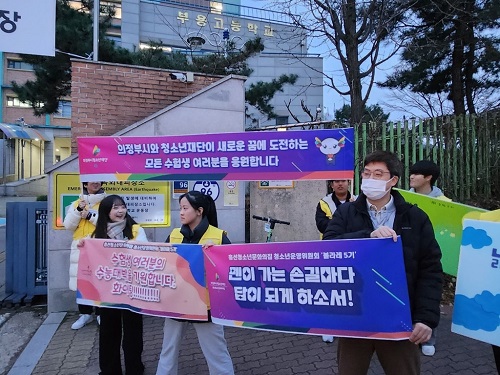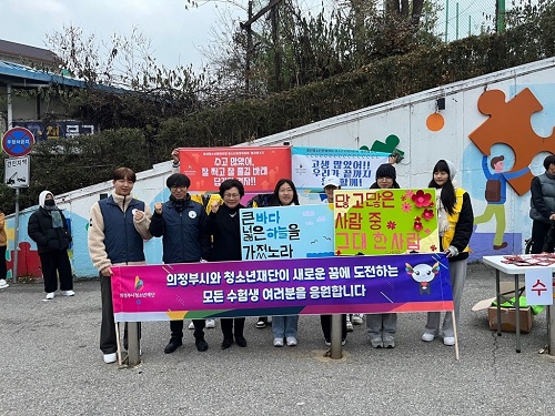 ÀÇÁ¤ºÎ½Ãû¼Ò³â¼ö·Ã°ü‘¼Ò³«ºñ’, »õ¸»Ã»¼Ò³â¼¾ÅÍ ‘ÇϳªÇ϶÷’, ÈQû¼Ò³â¼¾ÅÍ ‘º¼¶ó·¹’, °í»êû¼Ò³â¼¾ÅÍ ‘û¿Â’µî ÀÇÁ¤ºÎ½Ãû¼Ò³âÀç´Ü ¼Ò¼Ó û¼Ò³â¿î¿µÀ§¿øÈ¸ 50¸í°ú ÀÓÁ÷¿øµéÀÌ ÀÇÁ¤ºÎ °ü³» ¼ö´É °í»çÀå 8°³ Çб³¿¡¼ °í3 ¼öÇè»ýµéÀ» ÀÀ¿øÇϱâ À§ÇØ ÇѸ¶À½À¸·Î ¸ð¿´´Ù.