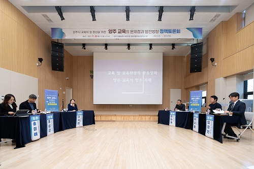 ¾çÁÖ ±³À°ÀÇ ¹®Á¦Á¡°ú ¹ßÀü¹æÇâ Á¤Ã¥Åä·Ðȸ¿¡ ¾Õ¼ Âü¼®ÀÚµéÀÌ ±â³ä ÃÔ¿µÀ» Çϰí ÀÖ´Ù.