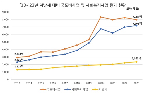 ¶ÇÇÑ, Áö³ 10³â°£ Áö¹æ¼¼ Áõ°¡¾×Àº 1õ44¾ï ¿ø(2013³â 1õ318¾ï ¿ø, 2023³â 2õ362¾ï ¿ø)ÀÎ ¹Ý¸é, »çȸº¹Áöºñ Áõ°¡¾×Àº Áö¹æ¼¼ Áõ°¡¾×ÀÇ ¾à 4¹èÀÎ 4õ876¾ï ¿ø(2013³â 2õ326¾ï ¿ø, 2023³â 7õ202¾ï ¿ø)À¸·Î ÆÄ¾ÇµÆ´Ù.