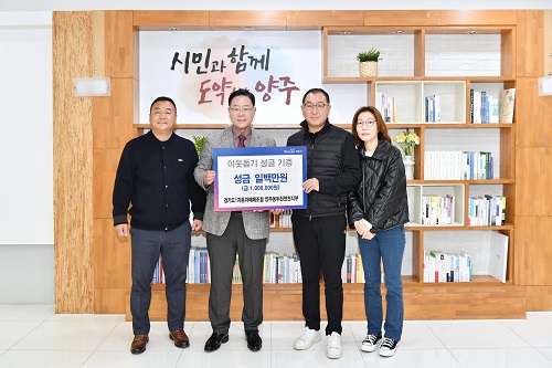 °æ±âµµ1ÀÚµ¿Â÷¸Å¸Å»ç¾÷Á¶ÇÕ ¾çÁÖ·µ¿µÎõ·¿¬ÃµÁöºÎ(ÁöºÎÀå À¯Àç°ü)´Â Áö³ 8ÀÏ ¾çÁÖ½Ã(½ÃÀå °¼öÇö)¸¦ ¹æ¹®ÇØ ¿¬¸»À» ¸Â¾Æ Áö¿ª»çȸÀÇ ¾î·Á¿î ÀÌ¿ôÀ» À§ÇØ ½á´Þ¶ó¸ç ¼º±Ý 100¸¸¿øÀ» ±âŹÇß´Ù°í ¹àÇû´Ù.