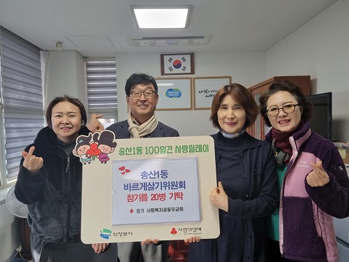 ÀÇÁ¤ºÎ½Ã ¼Û»ê1µ¿Áֹμ¾ÅÍ(µ¿Àå À̼ºÈñ)´Â 12¿ù 12ÀÏ ¼Û»ê1µ¿ ¹Ù¸£°Ô»ì±âÀ§¿øÈ¸(À§¿øÀå À̼ö¿ø)°¡ µ¶°Å³ëÀÎÀ» À§ÇÑ Âü±â¸§ 20º´À» ±âŹÇÏ¸ç ‘100Àϰ£ »ç¶û¸±·¹ÀÌ ¹èÅÏ ÀձⒿ¡ µ¿ÂüÇß´Ù°í ¹àÇû´Ù.