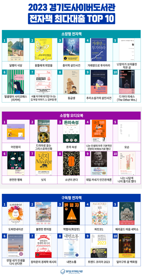 °æ±âµµ»çÀ̹öµµ¼°üÀÌ ‘2023³â ÀüÀÚÃ¥ ´ëÃâÅë°è’¸¦ ºÐ¼®ÇÑ °á°ú Áö³ ÇÑ ÇØ µ¿¾È °æ±âµµ¹Î¿¡°Ô °¡Àå ÀαⰡ ³ô¾Ò´ø ÀüÀÚÃ¥ 1À§´Â ¿À°¡¿Í ÀÌÅä ÀÛ°¡ÀÇ ‘´ÞÆØÀÌ ½Ä´ç’(¾Ë¿¡ÀÌÄ¡ÄÚ¸®¾Æ)ÀÎ °ÍÀ¸·Î ³ªÅ¸³µ´Ù. 2À§´Â Æ®¸®³ª Æ÷¿Ã·¯½º ÀÛ°¡ÀÇ ‘²Éµé¿¡°Ô Èñ¸ÁÀ»’(¼Ò´ãÃâÆÇ»ç), 3À§´Â Ä¡³Ù ¹ÌÄ«Åä ÀÛ°¡ÀÇ ‘Á¾ÀÌÇÐ »ìÀλç°Ç’(ºÏÇöóÀÚ)ÀÌ µÚ¸¦ À̾ú´Ù.