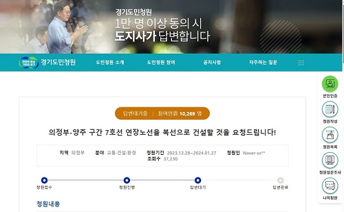 ÁÖ¹ÎÀÚÄ¡ÇùÀÇȸ´Â °æ±âµµ¿Í ±¹Åä±³ÅëºÎ¿¡ 7È£¼± ¿¬Àå¼±ÀÇ º¹¼±È¸¦ °ÇÀÇÇϱâ À§ÇÏ¿© °æ±âµµ¹Îû¿ø°ú ¼¸í¿îµ¿À» ÇÔ²² ÃßÁøÇßÀ¸¸ç, 1¿ù 25ÀÏÀ» ±âÁØÀ¸·Î µµÁö»ç ´äº¯ ±âÁØÀÎ 30Àϰ£ 1¸¸ ¸í ÀÌ»óÀÇ µ¿ÀǸ¦ ¹Þ¾Æ Á¤½Ä û¿øÀ¸·Î ¼º¸³µÇ¾ú´Ù. ÇÔ²² ÁøÇàÇÑ ¼¸í¿îµ¿µµ °ð ¸¶¹«¸®ÇÏ¿© ±¹Åä±³ÅëºÎ¿¡ 7È£¼± ¿¬Àå¼±ÀÇ º¹¼±È¸¦ û¿øÇÒ ¿¹Á¤ÀÌ´Ù.