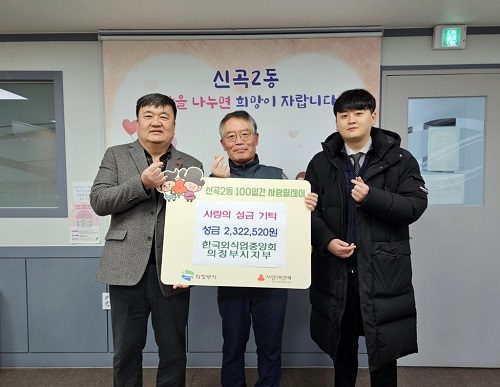 ÀÇÁ¤ºÎ½Ã ½Å°î2µ¿Áֹμ¾ÅÍ(µ¿Àå ±èÈ«ÀÏ)´Â Çѱ¹¿Ü½Ä¾÷Áß¾Óȸ ÀÇÁ¤ºÎ½ÃÁöºÎ(ÁöºÎÀå ±è¼º±º)°¡ Ãë¾à°èÃþ Áö¿øÀ» À§ÇØ ÀÌ¿ô»ç¶û ¼º±Ý 232¸¸2õ520¿øÀ» ±âŹÇß´Ù°í 13ÀÏ ¹àÇû´Ù.