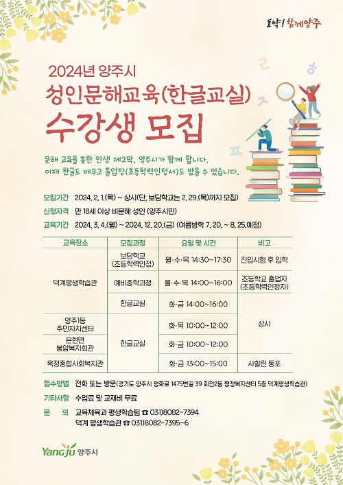 ¾çÁÖ½Ã(½ÃÀå °¼öÇö)°¡ ¹è¿òÀÇ ±âȸ¸¦ ³õÄ£ ½Ã¹ÎµéÀ» ´ë»óÀ¸·Î ±âÃÊÇнÀ ´É·Â °È¿Í »îÀÇ Áú Çâ»ó ±âȸ¸¦ Á¦°øÇϰíÀÚ ‘2024³â ¼ºÀι®Çر³À° ÇÁ·Î±×·¥’ ¼ö°»ýÀ» ¸ðÁýÇÑ´Ù°í 19ÀÏ ¹àÇû´Ù.