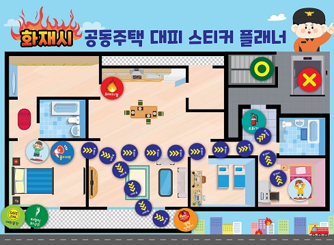 ‘°øµ¿ÁÖÅà ÈÀç´ëÇÇ ½ºÆ¼Ä¿ Ç÷¡³Ê’¾Õ¸é¿¡´Â °£´ÜÇÑ ±×¸²À¸·Î ±¸¼ºµÈ ¾ÆÆÄÆ® µµ¾È°ú ÀÚ¼® ½ºÆ¼Ä¿¸¦ ÅëÇØ ¿ì¸®Áý ¾ÆÆÄÆ® ±¸Á¶¿¡ ¸Â´Â ´ëÇǽü³(°æ·®Ä¸·ÀÌ, ´ëÇǰø°£, ¿Ï°±â µî)À» »ìÆìº¸°í ÈÀç ½Ã ´ëÇǵ¿¼±À» °¡Á· ±¸¼º¿øµé°ú ÇÔ²² »ý°¢Çغ¼ ¼ö ÀÖµµ·Ï ¸¸µéÁ®ÀÖ°í, µÞ¸é¿¡´Â ÈÀç ½Ã »óȲº° ´ëÇÇ¿ä·É°ú ¼Òȱ⠻ç¿ë¹ýÀÌ ³ª¿ÍÀÖ´Â ¼Ò¹æ¾ÈÀü±³À°¿ë ±³ÀçÀÌ´Ù.