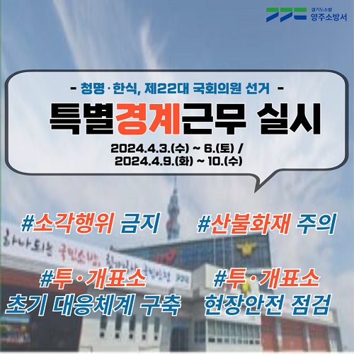 ¾çÁÖ¼Ò¹æ¼(°´ö¿ø ¼Àå)°¡ û¸í‧ÇѽÄ(2024.4.3. ~ 4.6.) ¹× Á¦22´ë ±¹È¸ÀÇ¿ø ¼±°Å ´ëºñ Ưº°°æ°è±Ù¹«(2024.4.9. ~ 4.10. °³Ç¥ Á¾·á ½Ã±îÁö)¸¦ °¢°¢ ÃßÁøÇÑ´Ù.