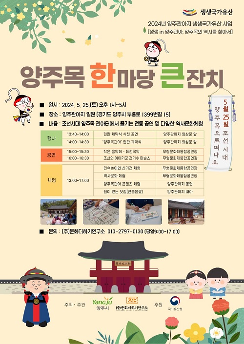 ¾çÁÖ°ü¾ÆÁöÀÇ È°¼ºÈ¸¦ À§ÇØ ÁøÇàµÇ´Â À̹ø Çà»ç´Â ¾çÁÖ¸ñ °ü¾Æ ÄÜÅÙÃ÷¿Í ÀüÅë³îÀ̸¦ ºñ·ÔÇÑ ¿ª»ç¹®ÈüÇè, ÀüÅë Ç»Àü °ø¿¬(ÀÛÀºÀ½¾Çȸ, Á¶¼±ÀÇ À̾߱â²Û Àü±â¼ö ¸¶¼ú¼î), ¾çÁÖ°ü¾ÆÁö ¿¾ »çÁøÀü, ÀüÅëÂþÁý, ½ºÅÆÇÁ ·¤¸® µîÀ» ÁøÇàÇÏ¿© ǰ°Ý ÀÖ´Â ¹®ÈÀ¯»êÀÇ È°¿ë »ç·Ê¸¦ ¼±º¸ÀÏ ¿¹Á¤ÀÌ´Ù.