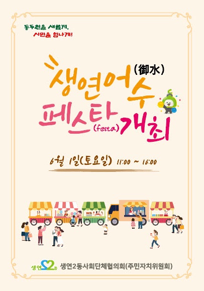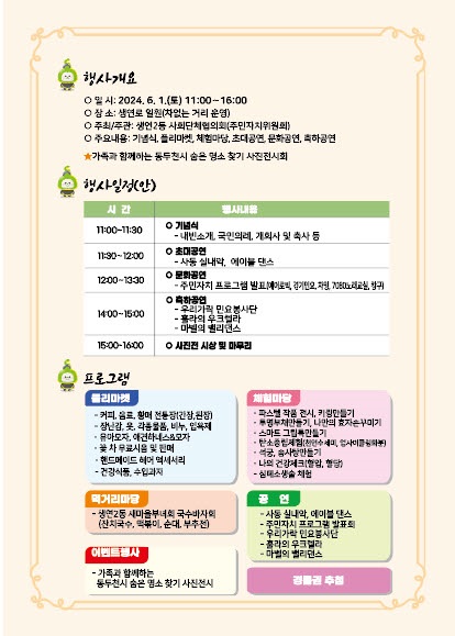 µ¿µÎõ½Ã »ý¿¬2µ¿ ÁÖ¹ÎÀÚÄ¡À§¿øÈ¸´Â ¿À´Â 6¿ù 1ÀÏ(Åä) 11½Ã¿¡¼ 16½Ã±îÁö »ý¿¬·ÎÀÏ¿ø(Â÷ ¾ø´Â °Å¸® ¿î¿µ)¿¡¼ '2024³â Á¦1ȸ »ý¿¬ ¾î¼ö(åÙâ©) Æä½ºÅ¸(FESTA)'¸¦ °³ÃÖÇÑ´Ù.