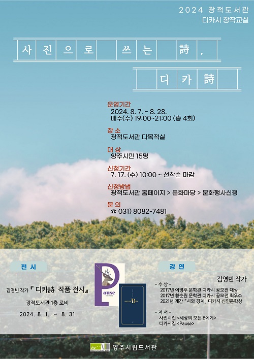 µðÁöÅÐ ½Ã´ëÀÇ ãæ ¹®ÇÐ À帣ÀÎ ‘µðÄ«½Ã’ÀÇ ±âº»À» ´ÙÁö°í, »çÁø°ú ½ÃÀÇ ¸Å·ÂÀ» µ¿½Ã¿¡ °æÇèÇØº¸´Â À̹ø ÇÁ·Î±×·¥Àº, ½ÃÁý <¼¼»óÀÇ ¸ðµç B¿¡°Ô> <Pause>ÀÇ ÀúÀÚ ±è¿µºó ÀÛ°¡ÀÇ ÁøÇàÀ¸·Î ÃÑ 4ȸ¿¡ °ÉÃÄ ¿î¿µµÉ ¿¹Á¤ÀÌ´Ù.