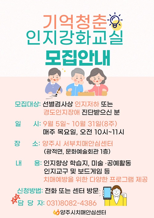 ¾çÁÖ½Ã(½ÃÀå °¼öÇö)°¡ Ä¡¸Å¾È½É¼¾ÅÍ¿¡¼ ¼±º° °Ë»ç»ó ÀÎÁö ÀúÇÏÀÚ ¹× °æµµÀÎÁöÀå¾Ö¸¦ Áø´Ü¹ÞÀº Ä¡¸Å °íÀ§Ç豺À» ´ë»óÀ¸·Î ‘±â¾ïûÃá ÀÎÁö°È ±³½Ç’À» ¿î¿µÇÑ´Ù°í ¹àÇû´Ù.