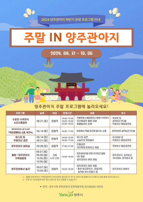 ¾çÁÖ½Ã(½ÃÀå °¼öÇö)´Â ¿À´Â 31ÀϺÎÅÍ 10¿ù 6ÀϱîÁö °ø¿¬°ú üÇè ¹× ³îÀÌ·Î ±¸¼ºµÈ ÇÁ·Î±×·¥ ‘ÁÖ¸» IN ¾çÁÖ°ü¾ÆÁö’¸¦ ¿î¿µÇÑ´Ù°í 8ÀÏ ¹àÇû´Ù.