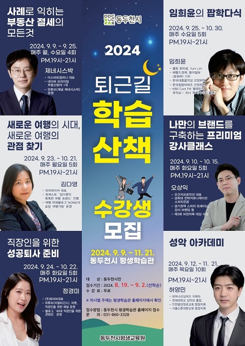 ¼ö° ´ë»óÀº µ¿µÎõ½Ã¹ÎÀ» ´ë»óÀ¸·Î Çϸç, ¸ðµç °Á´ ¹«·á·Î ÁøÇàµÈ´Ù. ¼ö° ½ÅûÀº 8¿ù 19ÀϺÎÅÍ 9¿ù 2ÀϱîÁö µ¿µÎõ½Ã Æò»ýÇнÀ°ü ȨÆäÀÌÁö¿¡¼ ¼±Âø¼øÀ¸·Î Á¢¼öÇϸç, ÀÚ¼¼ÇÑ °ÀÇ ÀÏÁ¤°ú ³»¿ëÀº Æò»ýÇнÀ°ü ȨÆäÀÌÁö¿¡¼ È®ÀÎÇÒ ¼ö ÀÖ´Ù.