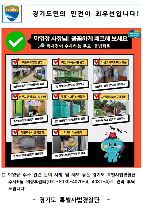 °æ±âµµ Ưº°»ç¹ý°æÂû´ÜÀÌ ¾ß¿µÀå¿¡¼ ¹ß»ýÇÒ ¼ö ÀÖ´Â ¾ÈÀü»ç°í ¿¹¹æÀ» À§ÇØ °¢Á¾ ¾ß¿µÀå ºÒ¹ýÇàÀ§¸¦ 8¿ù 26ÀϺÎÅÍ 9¿ù 6ÀϱîÁö ÁýÁß ¼ö»çÇÑ´Ù.