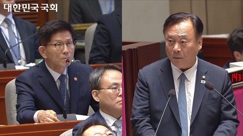 Áö³ 2ÀÏ ±¹È¸ ¿¹»ê°á»êƯº°À§¿øÈ¸ ÀüüȸÀÇ¿¡¼ ÀÌÀç° ÀÇ¿ø(¿À¸¥ÂÊ)ÀÌ ±è¹®¼ö ³ëµ¿ºÎÀå°ü(¿ÞÂÊ)¿¡°Ô ÁúÀÇÇϰí ÀÖ´Â Àå¸é(Ãâó=±¹È¸¹æ¼Û)