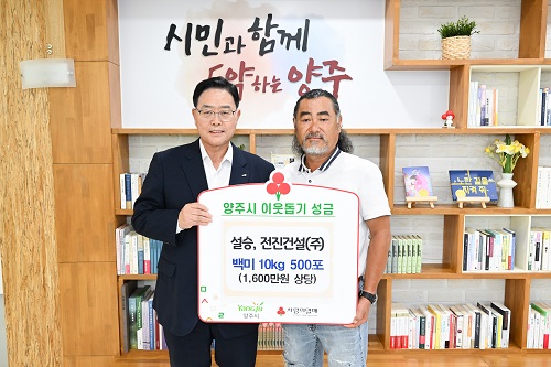 ¾çÁÖ½Ã(½ÃÀå °¼öÇö)°¡ ¼³½Â°Ç¼³(ÁÖ)(´ëÇ¥ Àü¼º¿)°ú ÀüÁø°Ç¼³(ÁÖ)(´ëÇ¥ Á¤±Ý¿Á)¿¡¼ °ü³» ¾î·Á¿î ÀÌ¿ôÀ» À§ÇØ ½á´Þ¶ó¸ç ¹é¹Ì 10kg 500Æ÷¸¦(1,600¸¸¿ø »ó´ç)À» ±âºÎÇß´Ù°í 12ÀÏ ¹àÇû´Ù.