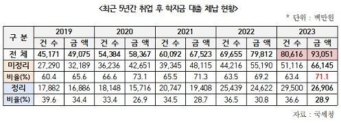 ±¹È¸ ±âȹÀçÁ¤À§¿øÈ¸ Á¤¼ºÈ£ ÀÇ¿ø(´õºÒ¾î¹ÎÁÖ´ç/µ¿µÎõ½Ã¾çÁֽÿ¬Ãµ±º °©)ÀÌ ±¹¼¼Ã»¿¡¼ Á¦Ãâ¹ÞÀº ÀÚ·á¿¡ µû¸£¸é Áö³ ÇØ Ãë¾÷ ÈÄ ÇÐÀÚ±Ý ´ëÃâ ü³³±Ô¸ð´Â 8¸¸°Ç, ÃÑ 930¾ï¿ø ±Ô¸ð·Î ¿ª´ë ÃÖ´ë´Ù. ÀÌ Áß ±¹¼¼Ã»ÀÌ °ÈÁö ¸øÇÑ ¹ÌÁ¤¸® ü³³±Ô¸ð´Â 5¸¸ °Ç, ¾à 661¾ï¿øÀ¸·Î Àüü ü³³¾× ´ëºñ ºñÁßµµ Äڷγª ¶§¿Í À¯»çÇÑ 70%´ë ¼±À» ³Ñ¾ú´Ù.