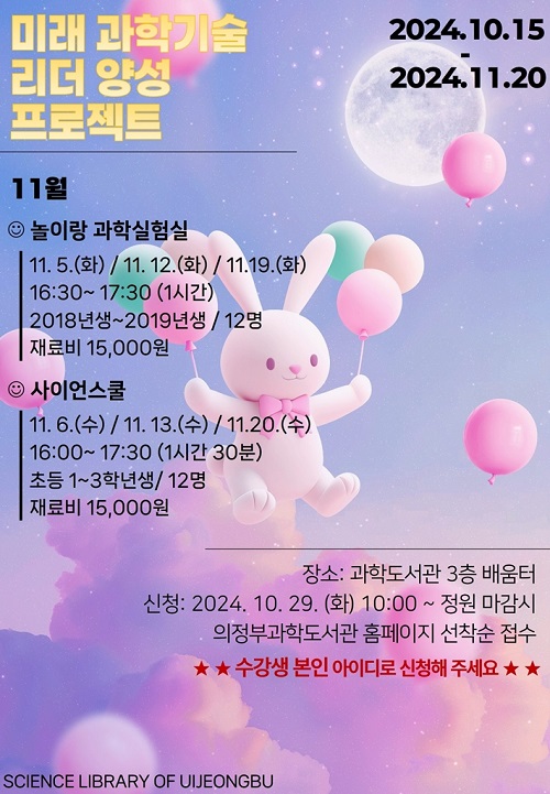ÀÇÁ¤ºÎ°úÇеµ¼°üÀº ‘¹Ì·¡ °úÇбâ¼ú ¸®´õ ¾ç¼º ÇÁ·ÎÁ§Æ®’ÀÇ ÀÏȯÀ¸·Î 2018~2019³â»ý ¹ÌÃëÇÐ ¾Æµ¿À» ´ë»óÀ¸·Î ÇÑ ‘³îÀ̶û °úÇÐ ½ÇÇè½Ç’°ú Ãʵî 1~3Çгâ ÇлýÀ» ´ë»óÀ¸·Î ÇÑ ‘»çÀ̾ð½ºÄð’À» 11¿ù 5ÀϺÎÅÍ 20ÀϱîÁö ¿î¿µÇÑ´Ù.