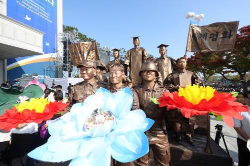 ¶Ç ½ÅõÁö ûÁÖ±³È¸ °Ç¹° ¾Õ ±¤Àå¿¡¼´Â Á¾±³ÀεéÀÌ ºÐÀï°ú ¹Ý¸ñÀ» ±×¸¸µÎ°í »óÈ£ ÈÇÕÇÏ¿© ÀüÀïÀ» Á¾½ÄÇØ Æòȸ¦ ÀÌ·çÀÚ´Â ÀǹÌÀÇ Æ¯º° ÆÛÆ÷¸Õ½º°¡ ÆîÃÄÁ® Âü¼®ÀÚµé·ÎºÎÅÍ Å« ¹Ú¼ö¸¦ ¹Þ¾Ò´Ù.