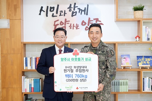 ¾çÁÖ½Ã(½ÃÀå °¼öÇö)´Â 7ÀÏ ¿ÀÀü 8»ç´Ü È»ý¹æ´ë´ë ÁÖÀÓ¿ø»ç ¿ø±âö¾¾°¡ ½ÃûÀ» ¹æ¹®ÇØ °ü³» ¾î·Á¿î ÀÌ¿ôÀ» À§ÇØ ½á´Þ¶ó¸ç ¹é¹Ì 760kg(250¸¸¿ø »ó´ç)¸¦ ±âºÎÇß´Ù°í ¹àÇû´Ù.