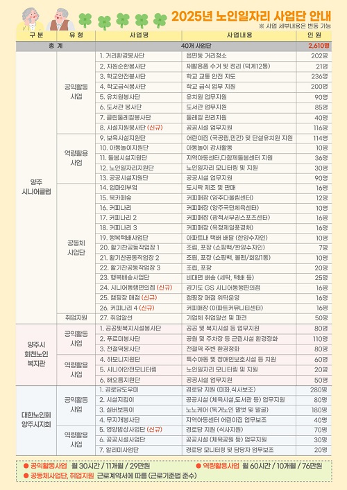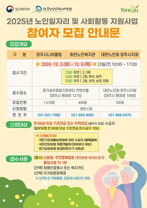 ¾çÁÖ½Ã(¾çÁÖ½ÃÀå °¼öÇö)°¡ ¿À´Â 12¿ù 3ÀϺÎÅÍ 5ÀϱîÁö ÃÑ 3Àϰ£ ¾î¸£½ÅµéÀÇ »çȸÂü¿© Ȱ¼ºÈ¸¦ À§ÇÑ ‘2025³â ³ëÀÎÀÏÀÚ¸® ¹× »çȸȰµ¿ Áö¿ø»ç¾÷’ÀÇ Âü¿©ÀÚ¸¦ ¸ðÁýÇÑ´Ù°í ¹àÇû´Ù.