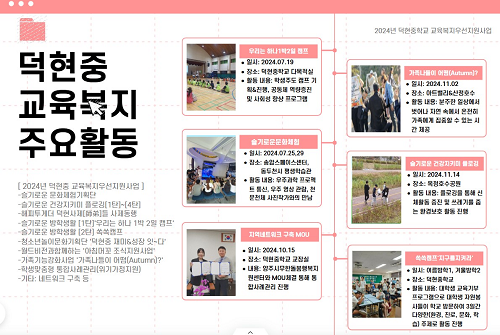 2024³âµµ ´öÇöÁßÇб³´Â ¡â¿ì¸®´Â Çϳª ‘1¹Ú 2ÀÏ Ä·ÇÁ’ ¡â°¡Á·³ªµéÀÌ ¾î¶¶(Autumn)? ¡â½½±â·Î¿î ¹®ÈüÇè ¡â½½±â·Î¿î °Ç°ÁöŰ¹Ì ÇÃ·Î±ë ¡âÁö¿ª³×Æ®¿öÅ© MOUü°á ¡â½ï½ïÄ·ÇÁ ‘Áö±¸¸¦ ÁöÄÑ¶ó’ µîÀÇ ÁÖ¿ä Ȱµ¿À» ÁøÇàÇß´Ù.